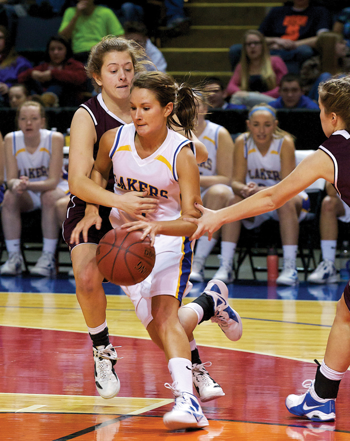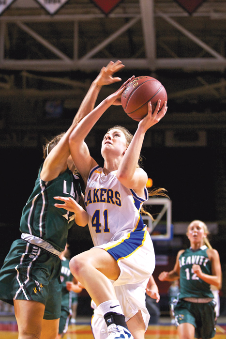 - TO THE HOOP — Lake Region junior forward Kelsey Winslow takes the ball strong to the basket against a Leavitt defender during last week’s semi-final. (Photo by Greg Van Vliet)