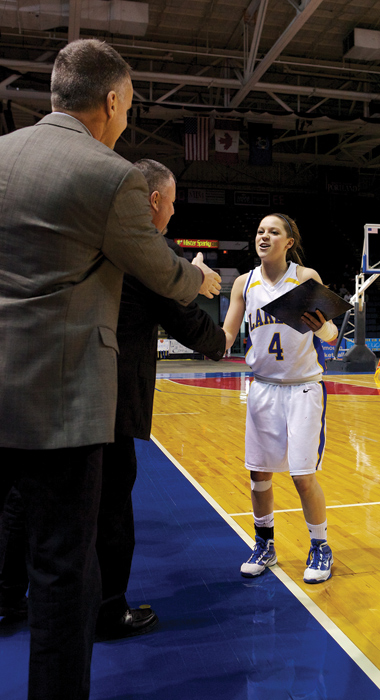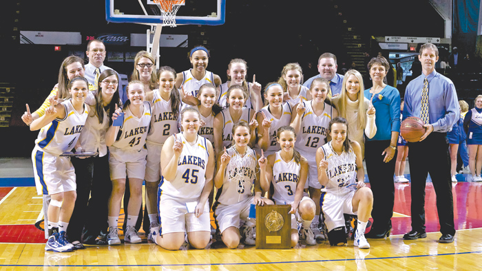 - OUTSTANDING PLAYER-SPORTSMAN — Lake Region junior Sydney Hancock was named the Mike DiRenzo Award winner as the Class B West tournament’s outstanding player-sportsman. Sydney is the fifth Laker to receive the award since it was first established in 1977 , earned that year by Kelley Kimball. Other LR recipients were: Sam Allen, ZZ Leighton and Renee Nicholas. (Photo by Greg Van Vliet)