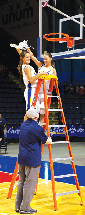 - BEST OF THE WEST — Lake Region seniors Abby Craffey (left) and Rachel Wandishin twirl the net after the Lakers beat Greely 49-30 to win the Class B West girls’ basketball title Saturday at the Cumberland County Civic Center. The Lakers (19-2) travel to the Bangor Auditorium Friday in search of a Gold Ball. The Lakers meet East champ Presque Isle (21-0) at 7 p.m. (Photo by Greg Van Vliet)