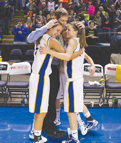 - HAPPY MOMENT shared by LR Coach Paul True with Abby Craffey (left), Sydney Hancock (right) and Rachel Wandishin (back). (Photo by Greg Van Vliet)